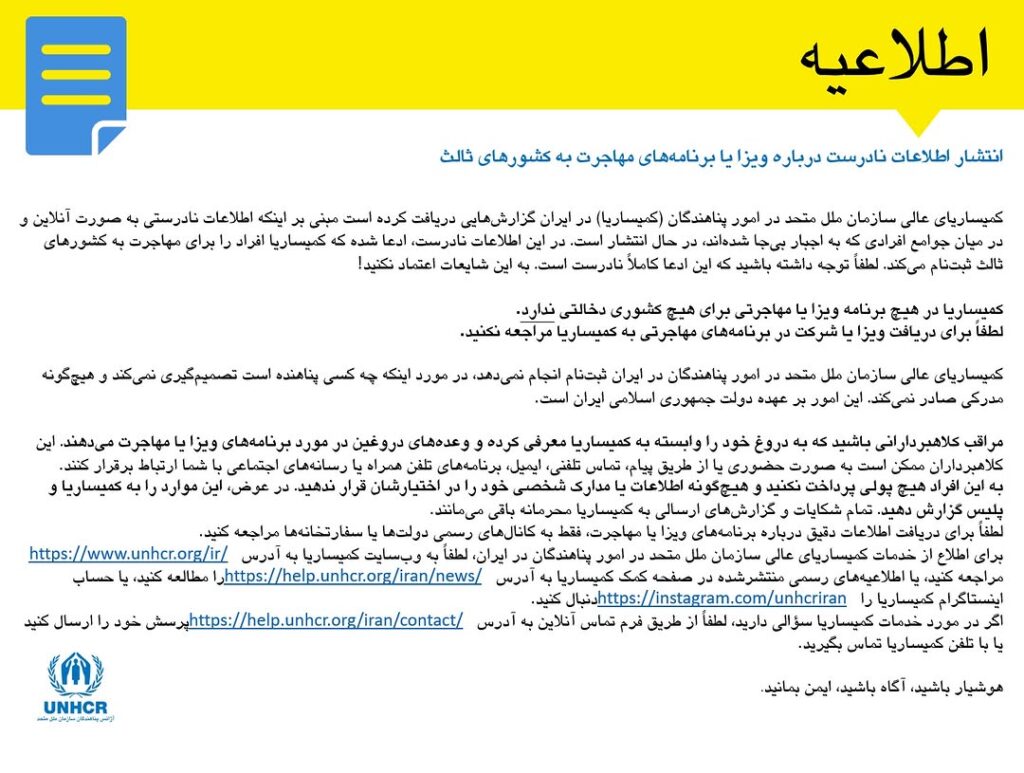 کمیساریای عالی سازمان ملل متحد در امور پناهندگان (UNHCR) در ایران اعلام کرده است که اخیراً گزارشهایی مبنی بر انتشار اطلاعات نادرست در فضای مجازی درباره ویزا یا برنامههای مهاجرتی به کشورهای ثالث دریافت کرده است.