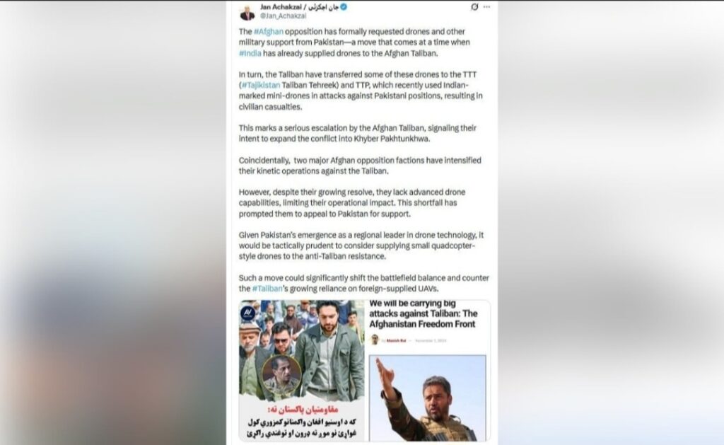 «جان اچکزی» وزیر پیشین اطلاعرسانی پاکستان در شبکه ایکس نوشت که مخالفین مسلح طالبان از پاکستان درخواست پهپاد و سایر کمکهای نظامی کرده است. بهگفتهٔ وی، این درخواست در حالی مطرح میشود که هند پیشتر تعدادی پهپاد به طالبان افغانستان تحویل داده و طالبان نیز بخشی از این پهپادها را در اختیار گروههای همسو مانند […]