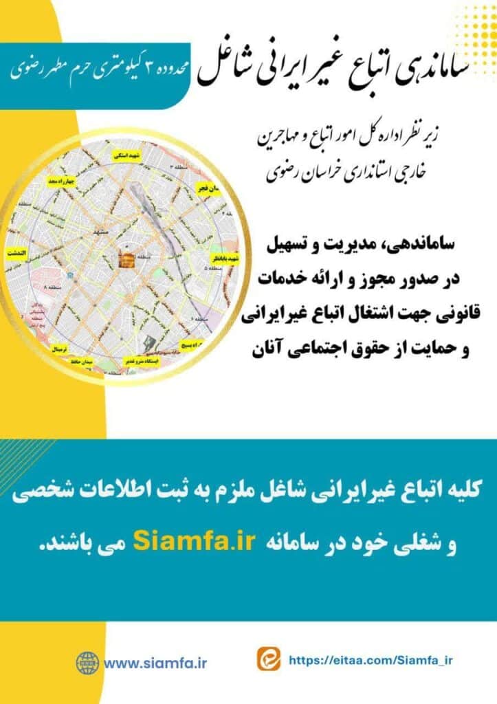 اداره کل امور اتباع و مهاجرین خارجی استانداری خراسان رضوی از آغاز فرآیند ثبتنام و ساماندهی اتباع غیرایرانی شاغل در محدوده سه کیلومتری حرم مطهر رضوی خبر داد. بر اساس اعلام این اداره، متقاضیان میتوانند از طریق سامانه رسمی به نشانی Siamfa.ir مراحل ثبتنام خود را انجام دهند.