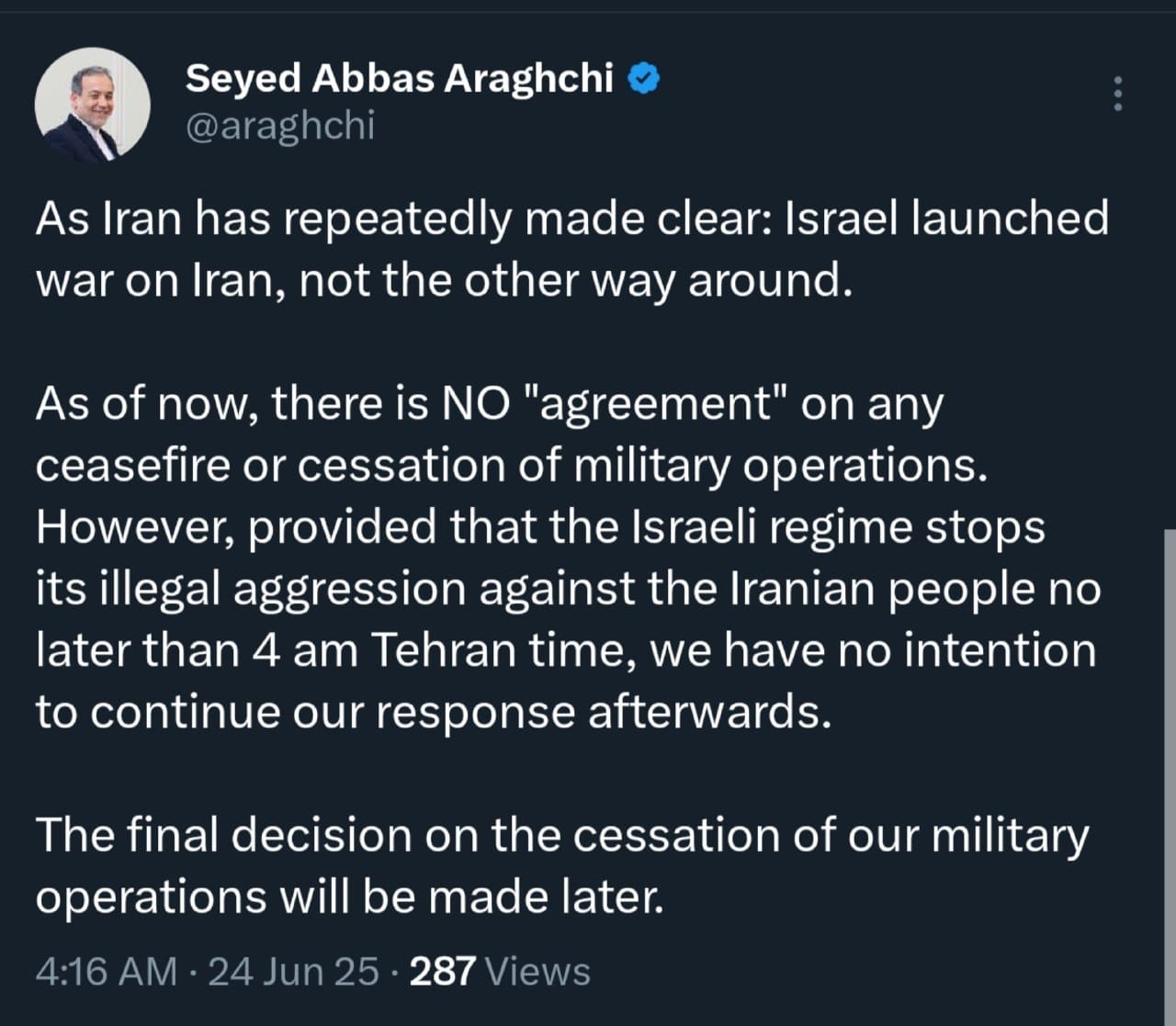 همانگونه که مکرراً گفته ایم، این رژیم اسرائیل بود که جنگ را آغاز کرد نه ما. در حال حاضر توافقی در