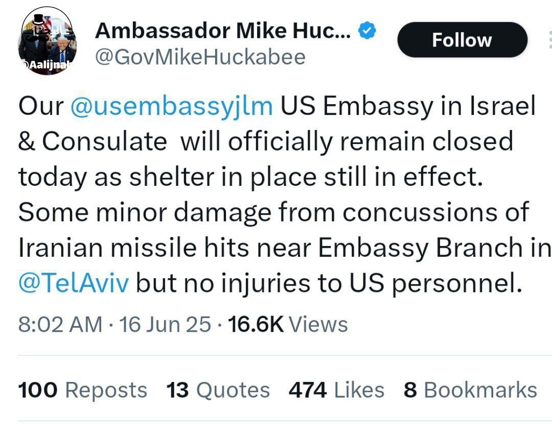 هاکابی سندرز، سفیر ایالات متحده در اسرائیل: به دنبال حملات موشکی ایران به تلآویو و وقوع انفجار در نزدیکی سفارت آمریکا،
